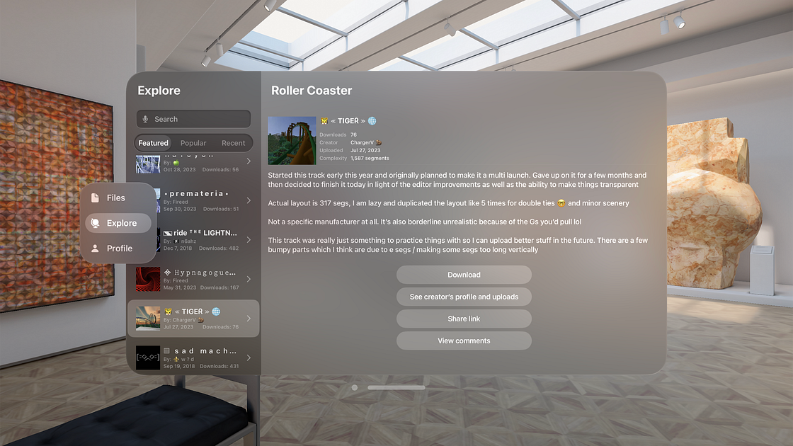 Browse and download amazing roller coasters uploaded by our online community, buckle up, and experience their creations like never before, in fully immersive, heart pumping 3D on the amazing Apple Vision Pro.