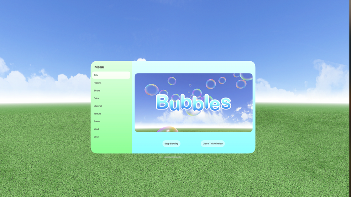 Bubbles Vision is just for blowing bubbles in an immersive space. You can also touch bubbles by your hands.