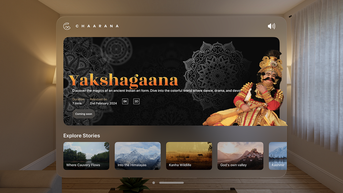 Chaarana is an app exclusively designed for Apple Vision Pro that redefines storytelling by crafting immersive experiences that bring to life the rich heritage and diverse landscapes of India for audiences across the globe. Blending together different media formats with immersive soundscapes, Chaarana is a virtual tourism app that brings the best of Indian culture, heritage and nature to global audiences.