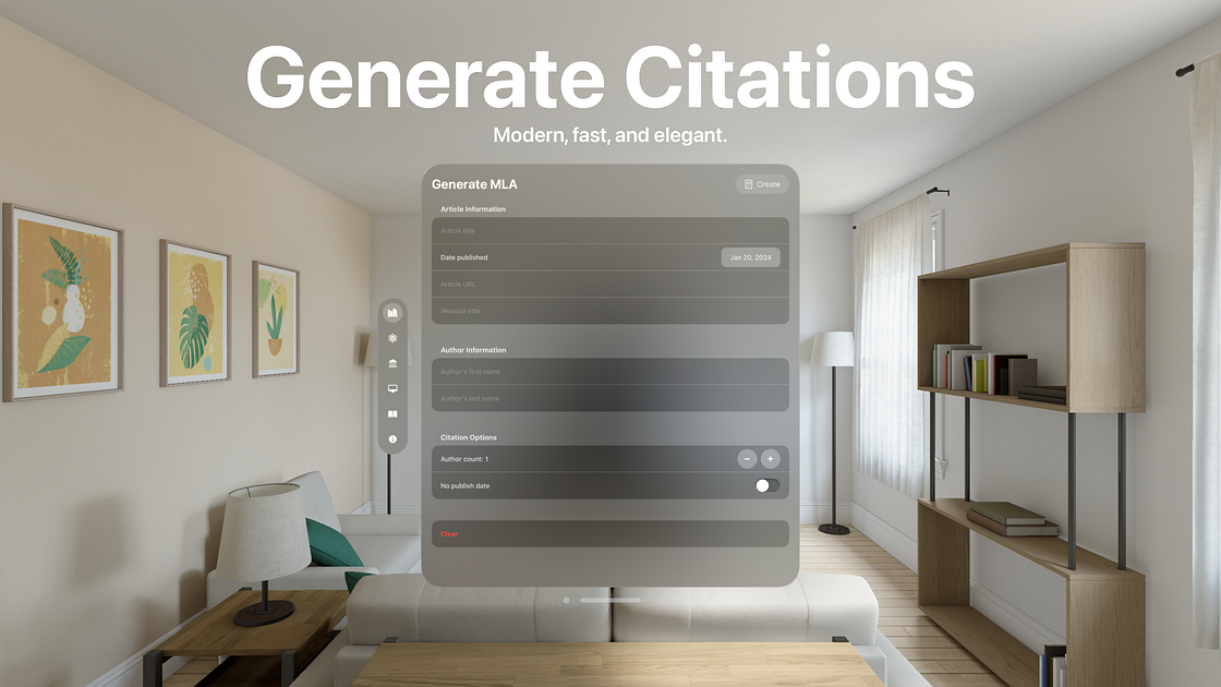 Citationsβ user interface was designed to be simple and easy to use. Just pick a format, fill out the fields, and tap one button to format the website citation properly. The entire process is seamless and quick, with zero latency or load times. Itβs designed beautifully for Apple Vision Pro following Apple Human Interface Guidelines and has support for the latest Apple technologies. Citations feels right at home on visionOS, blending in seamlessly with your surroundings and other apps β helping you do your work, whenever you need it. Itβs the first of its kind made specifically for Apple Vision Pro.