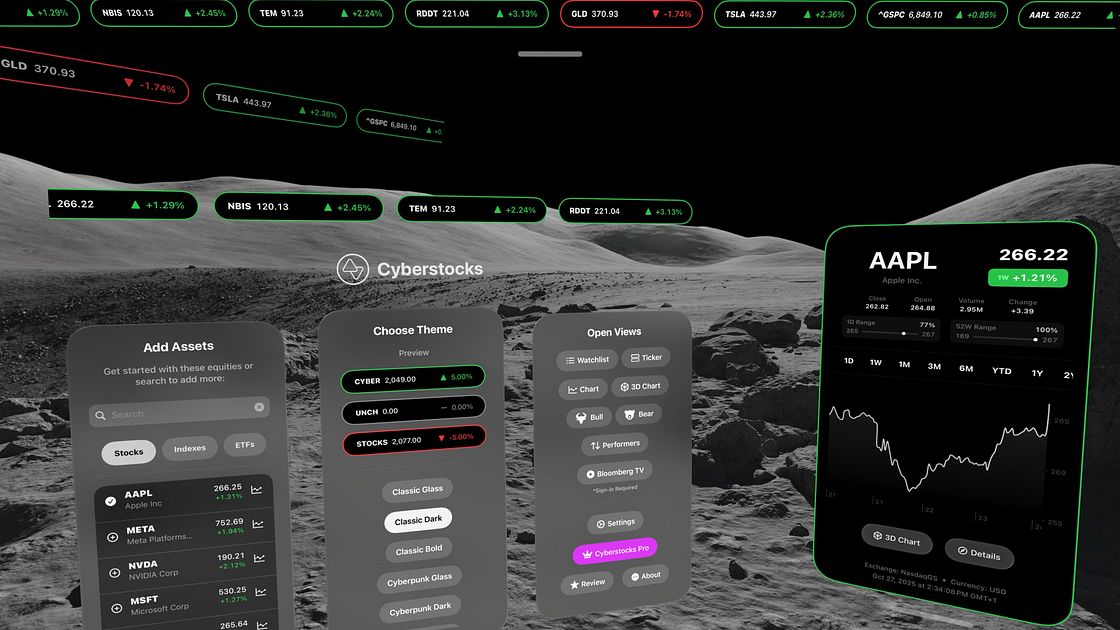 Step into the future of finance. Cyberstocks brings real-time markets into your space, where data floats around you, charts come alive in 3D, and themes glow with a cyberpunk edge. No account setup, no data collected.