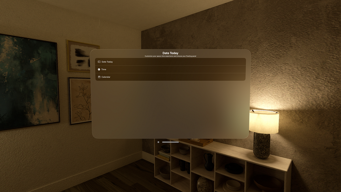 See today's date and time at a glance from your space with the help of this floating panel on your Apple Vision Pro. Experience the convenience of checking today's date and time at a glance with my sleek floating panel widget. The Date Today app simplifies your space by providing instant access to the current time, day, and date. Featuring a dynamic panel showcasing the current time, a comprehensive date and time display, and a convenient calendar view, staying organized has never been easier. Upgrade your daily routine with Date Today â your go-to companion for staying informed and on schedule.