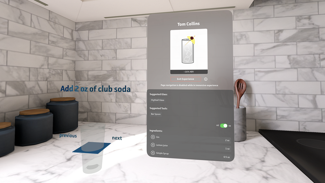DrinkSmith is the world's first immersive bartending experience. Users can simply select a recipe, place down a virtual glass, and create 300+ craft cocktails without ever needing a measurement tool.