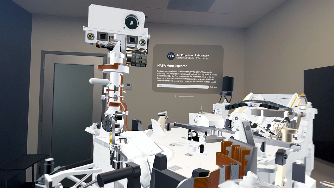 Version 1 brings Perseverance into the room with you. Select key parts of the rover to view photographs and specifications plus learn how they contribute to the groundbreaking science of NASA's Mars Exploration Program. Resize the rover from a small model you can rest on your lap to actual size, and move it anywhere in your space.
