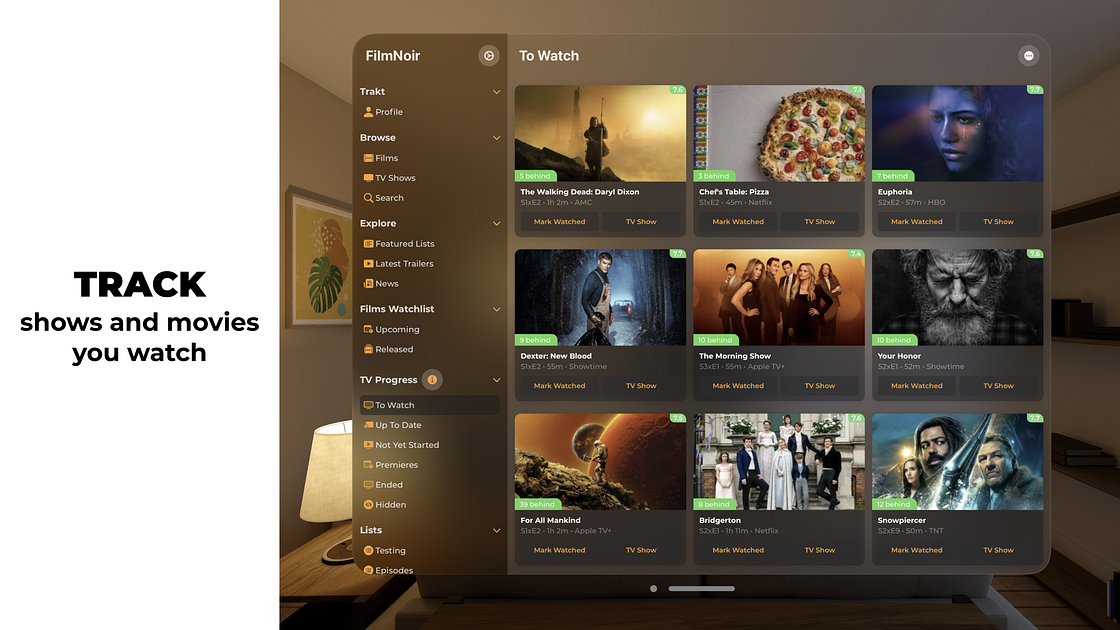 FilmNoir organizes your Trakt TV watchlist, allowing you to customize the layout and sorting of each section.