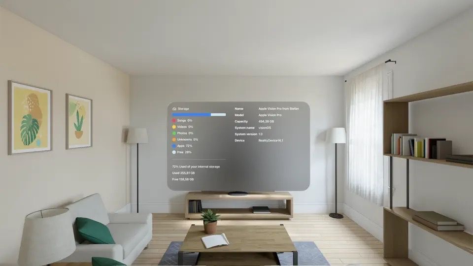 Want to see your totally free space left on your storage? See today's current free space on your internal drive at a glance from your Apple Vision Pro with the help of a simple app. The Hard Disk app is a handy and informative tool. And it includes an overview of your system information in one central place you can place in your room.
