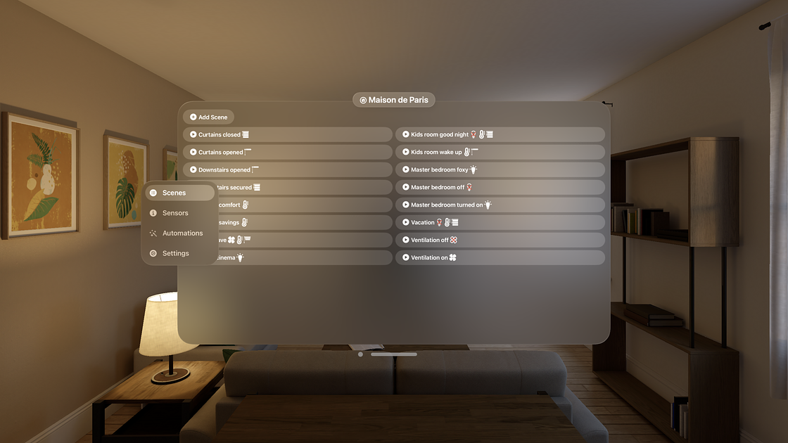 1. Create scenes that match all the moods you want by setting the relevant Matter or Apple HomeKit compatible devices once and for all: turn on the right lights, set their intensity, their color, adjust the temperature, the shutters, and give a name for example "Home cinema".