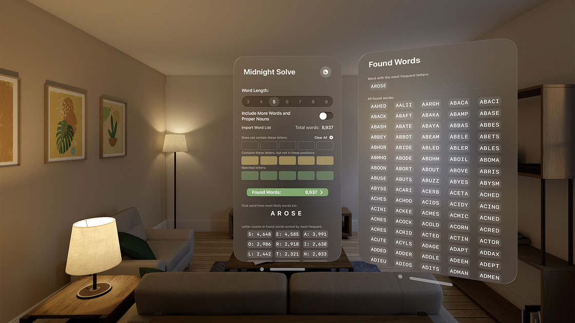 Need a little help solving the latest word game? Try out Midnight Solve! Select a word length between three and nine letters, five is a popular choice. Solve will provide a word with the most frequent letters from the available choices, use it, or any word you like. Once you have results, enter the letters in the app, multiple letters in gray or yellow positions as needed. Solve will filter the word list and provide all words that match the conditions. For alternative puzzles that use unusual words you may find that enabling the extended word lists which contain names may be useful. You can even load your own custom word lists. Happy solving!