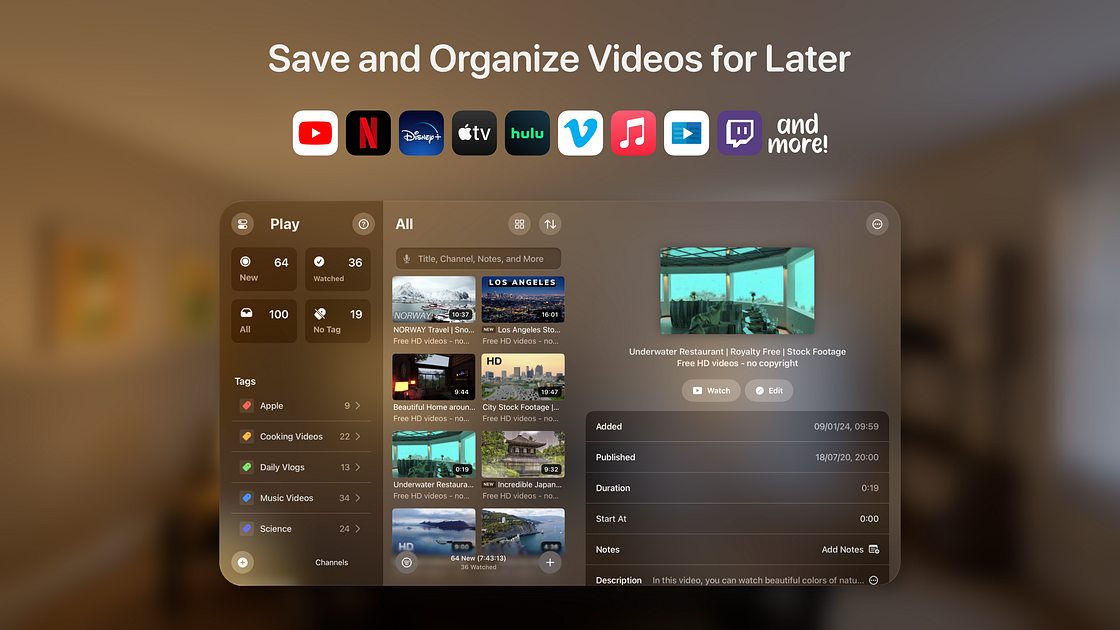 Add videos via drag and drop them, import from a playlist, or automatically from YouTube channels*. Organize them with tags, add notes, assign a star rating, and more. Watch supported YouTube videos in-app for a native experience. Follow YouTube channels and get new videos as they're released*. Easily save videos you want to watch and delete the rest. iCloud sync keeps your database up-to-date on your iPhone, iPad, Mac, Apple TV, and Apple Vision Pro.