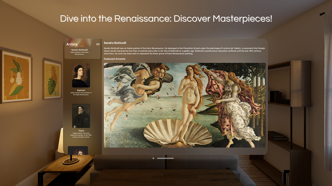 Discover the fascinating world of the Renaissance with our exclusive app designed specifically for Vision Pro. Immerse yourself in the lives and masterpieces of the great artists of that golden era. From Leonardo da Vinci to Michelangelo, each artist has their own virtual space, where we highlight their history, their main masterpiece, and a detailed description of their impact on the art world.