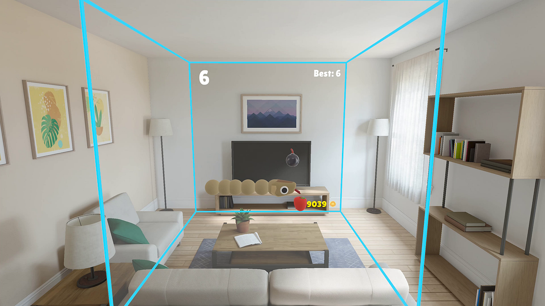 This game redefines the classic snake game with Spatial 3D mechanics. Using air pinch, drag, and swipe gestures, players control the snake, which teleports upon touching any wall. Collect apples, dodge bombs, compete globally on leaderboards, and unlock new animals with collected coins for an immersive gaming experience.