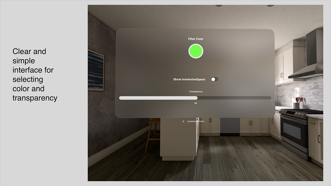 Both the color and transparency can be changed easily either before, or after you enter the immersive space. Simply tap the color button to select a different color. Tap and drag the slider to modify transparency levels.