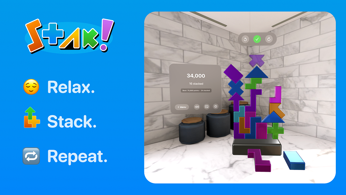 STAK! is the spatial block stacking experience you didn't realize you needed. Take a deep breath and see how high you can stack â with 18 colorful shapes across Relaxed, Classic, and Expert modes, 4 original songs and lots of satisfying sound effects by Jynjo, 50 "inspirational" messages to keep you going, and high score tracking for every difficulty. Stick with it, and you'll become a STAK! master in no time.