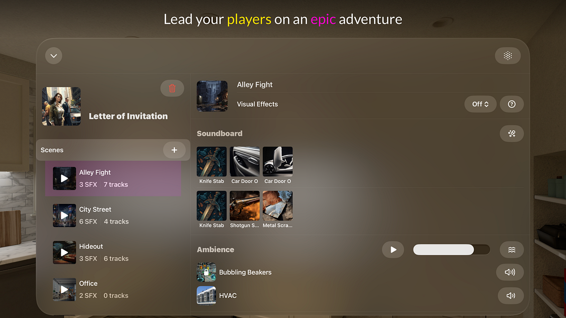 Summoning Stone offers a range of key features that set it apart from other RPG apps. Enjoy Apple Music integration to import your existing playlists, while organized scenes by campaign let you keep your fantasy and sci-fi games separate. With layered ambience, you can combine sounds to create unique experiences like creaking wood, wind, and waves for a sailing adventure. Customize your sound board to trigger effects at any moment, and use screen mirroring to project your artwork and maps on a big screen for all players to see.
