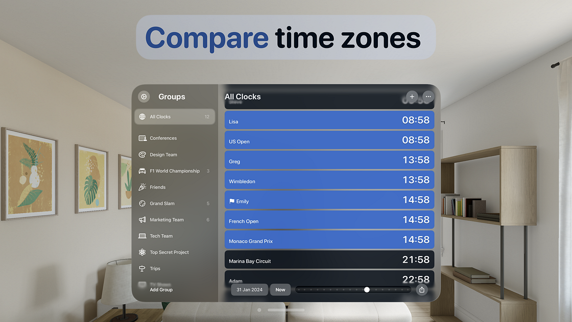 âĸ Groups - Organize clocks into groups such as friends, teams, projects or international events