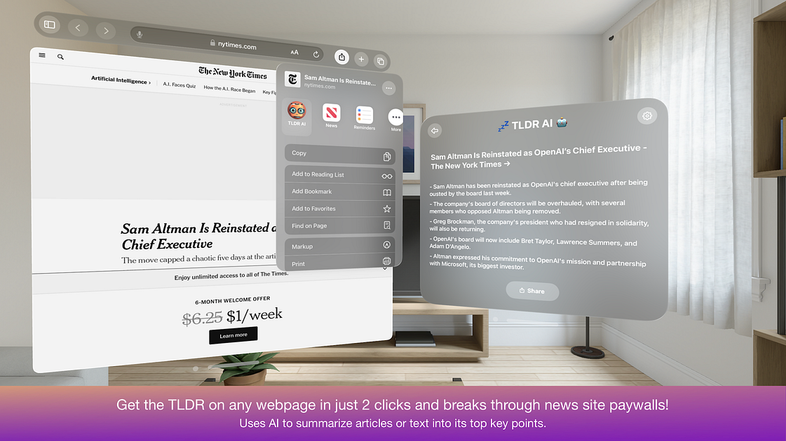 Get the TLDR of any article in just 2 clicks + breaks through news site paywalls! It uses AI to summarize text into its top key points. Use the app directly to summarize any URL link or chunk of text.