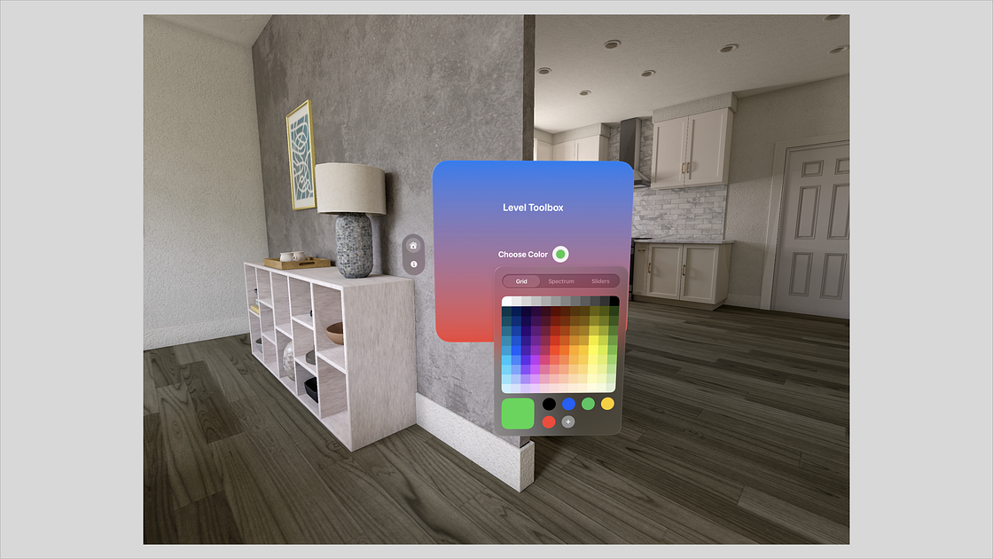 This is a virtual toolbox containing horizontal and vertical levels, running in a mixed immersive environment.
